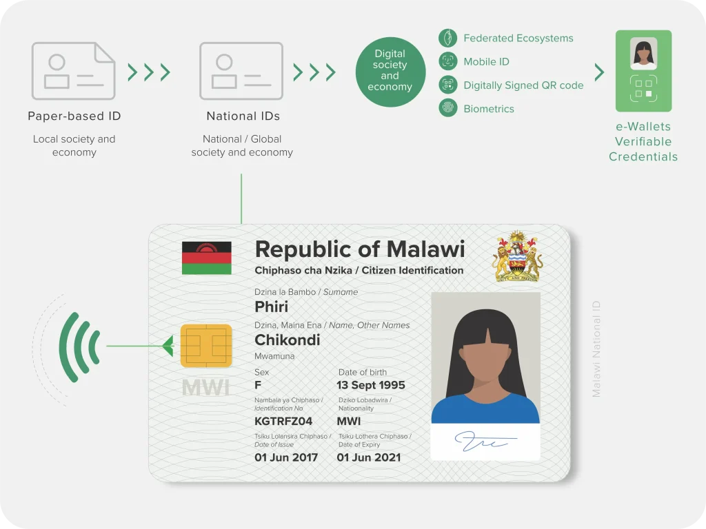 The Malawi National ID (NID) is a digital ID based on ICAO standards that includes the biometric and biographic data of the individuals. The NID has a unique identification number, QR Code and Machine-Readable Zone. The NID is used as legal identity and proof of citizenship. Use cases of NID are: